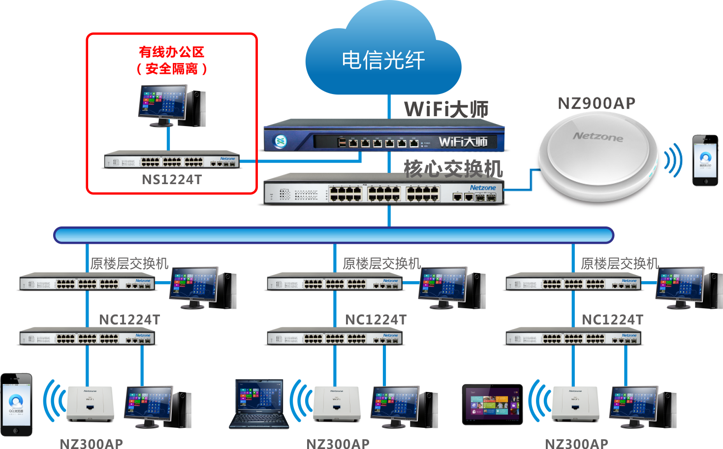 2、NZ300AP和NZ900AP的供电由poe供电交换机,数据传输通过poe供电交换机或POE供电器连接至各楼层所属配线间的楼层交换机上。采用POE供电方式,无需额外部署电力线,缩短40%施工时间,几乎不影响酒店正常营业;